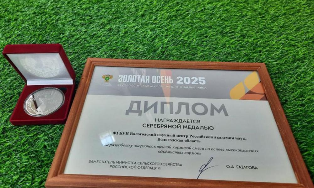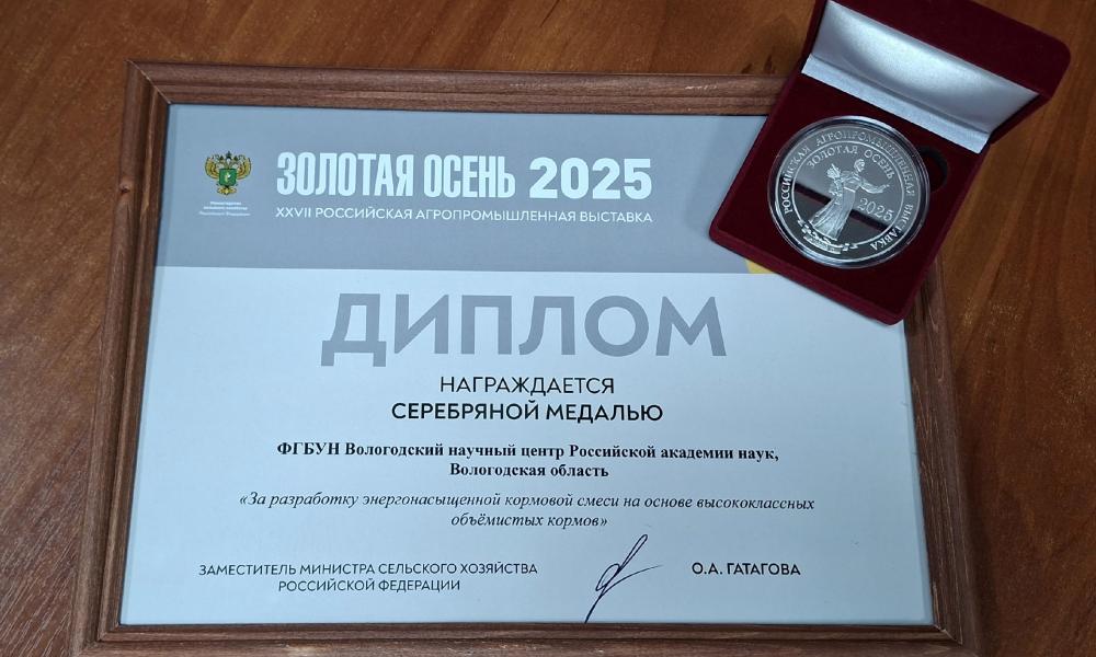 9 октября 2025 года состоялась церемония награждения победителей XXVII Российской агропромышленной выставки «Золотая осень – 2025», проводимая Департаментом животноводства и племенного дела Министерства сельского хозяйства РФ. Исследование сотрудников СЗНИИМЛПХ – обособленного подразделения Вологодского научного центра РАН – было отмечено серебряной медалью и дипломом «За разработку энергонасыщенной кормовой смеси на основе высококлассных объемистых кормов», которая способствует повышению уровня молочной продуктивности дойных коров.