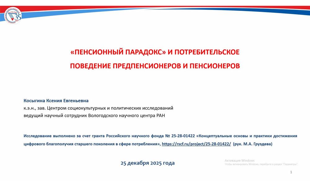 25 декабря 2025 года заведующий Центром социокультурных и политических исследований ВолНЦ РАН, в.н.с. к.э.н. Ксения Евгеньевна Косыгина представила доклад на тему «“Пенсионный парадокс” и потребительское поведение предпенсионеров и пенсионеров» на заседании постоянно действующего научного семинара-дискуссии «Социальная экономика» в рамках научной школы ВолНЦ РАН «Проблемы социально-демографического развития территорий» (руководитель – д.э.н., доцент А.А. Шабунова). Результаты получены в рамках выполнения грантового проекта при поддержке РНФ № 25-28-01422 «Концептуальные основы и практики достижения цифрового благополучия старшего поколения в сфере потребления» (рук. М.А. Груздева).